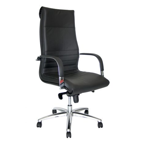 PADOVA Uredska fotelja visokog naslona, sjedalo i naslon tapecirani u kožu. Rukonasloni fiksni, kromirani, presvučeni poliuretanom u crnoj boji, mekani na dodir. Peterokraka baza aluminijska, promjera 70 cm; kotači za mekane podove. Podešavanje visine sjedala, podešavanje tenzije, podešavanje nagiba naslona pomoću tilting mehanizma s mogućnošću zaključavanja u 5 pozicija.