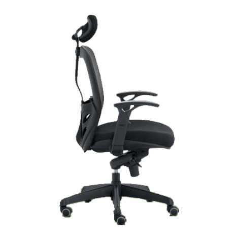EMP Ergonomska uredska stolica s naslonom za glavu u crnoj tkanini, te naslonom izrađenim od poliamida ojačanog staklenim vlaknima s crnom mrežom. Sjedalo izrađeno od ploče višeslojnog drva, i obloge od polipropilena, podstavljene hladno lijevanom poliuretanskom pjenom i tapecirano u crnoj tkanini. Rukonasloni podesivi po visini. Podešavanje visine i sinkro podešavanje nagiba naslona i sjedala. Baza peterokraka s kotačima za meke podove.
